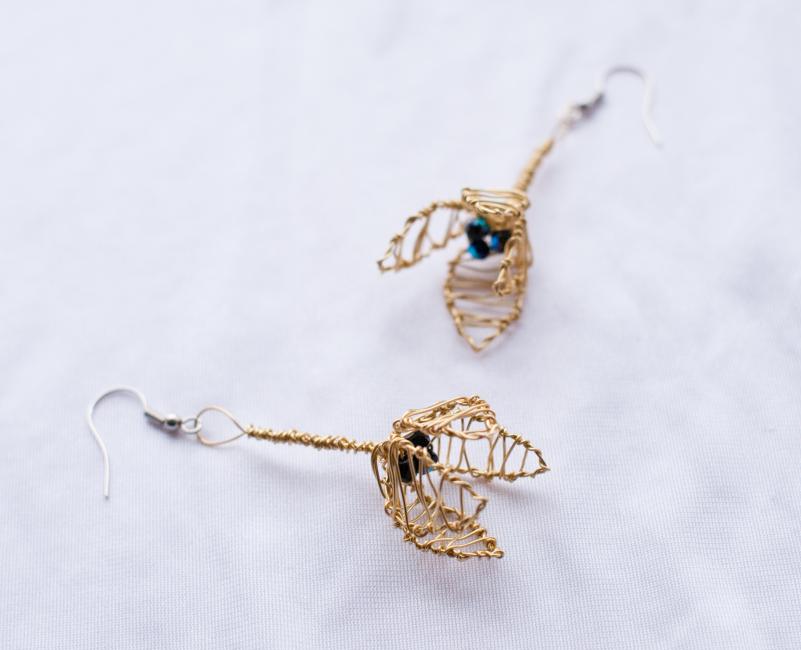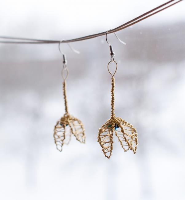 Ljust guldfärgade blomörhängen på stjälk med tre små svarta och glänsande pärlor inuti. Dessa är beställningsjobb men liknande kan beställas för 225 kr.