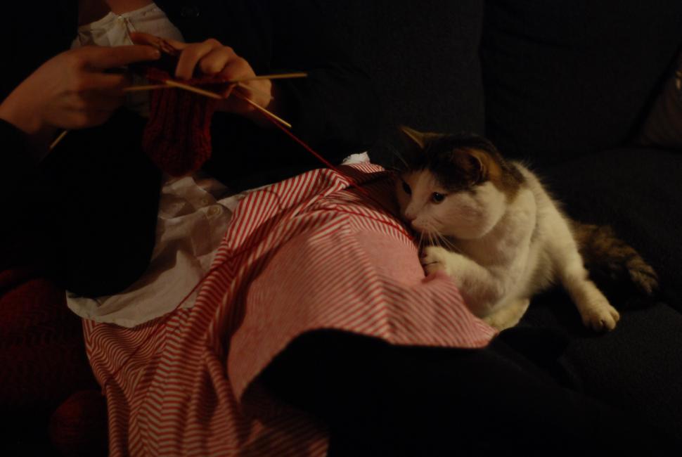 Systern stickar raggsockar till mig. Astor vill också vara med. Han vaknar upp från kvällens andra vila för att jaga tråd en stund.
