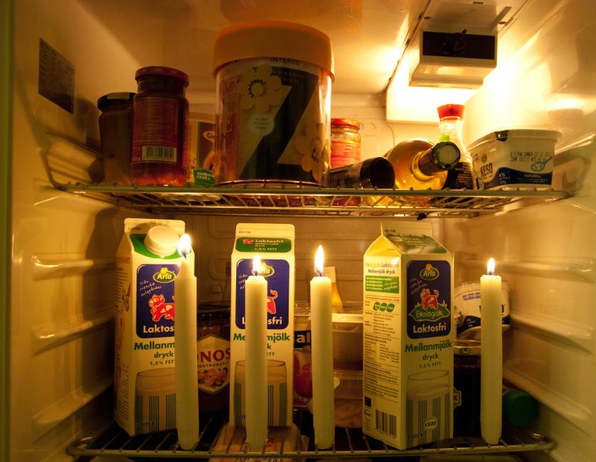 Till julen proppar man kylskåpen fulla med mat och godis. I vår kyl har vi mest mjölkpaket.