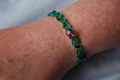 Överst: Armband av grönfärgad koppartråd och turkosblått sidenband med rosa pärla på. Underst: Armband av silverfärgad koppartråd med turkosblått sidenband och olika blå och rosalila pärlor.