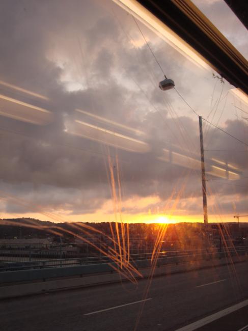 Solnedgång genom repat spårvagsfönster.