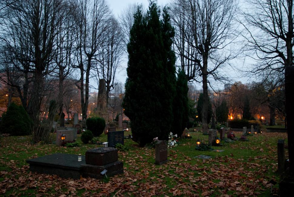 Vi promenerade hem genom kyrkogården som lyste så vackert i kvällen. Allahelgona, var det ju.