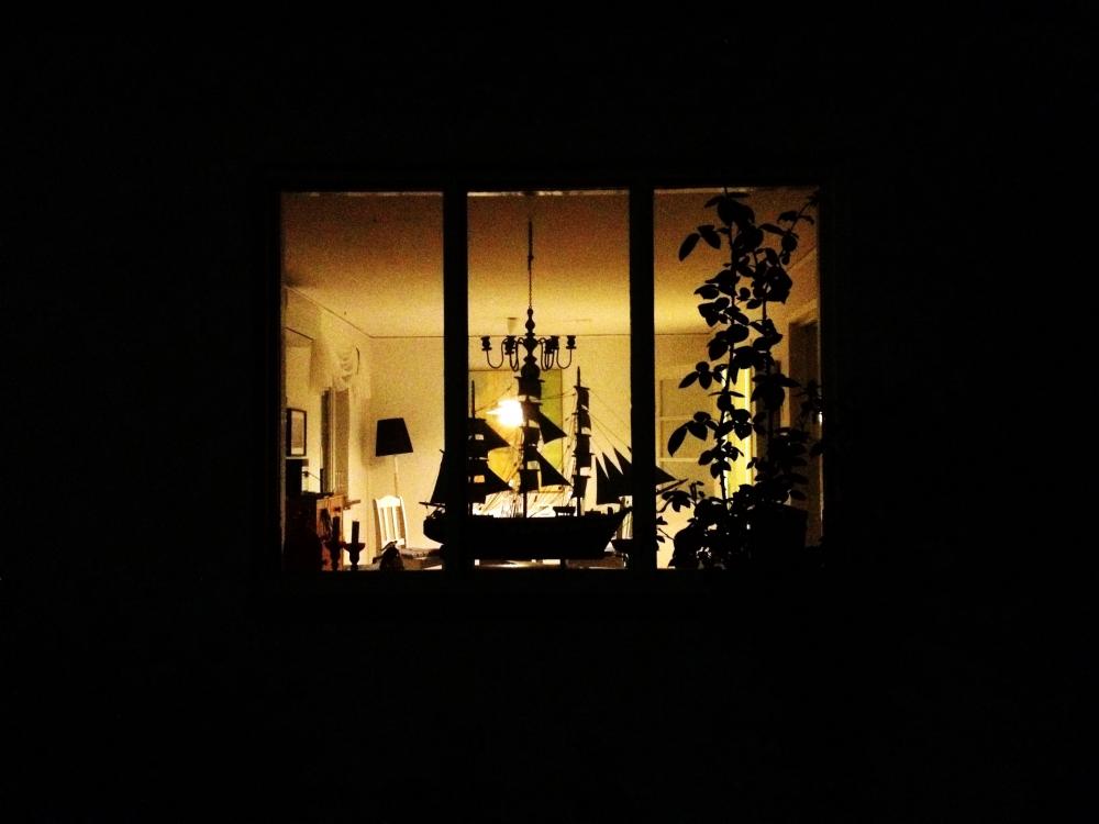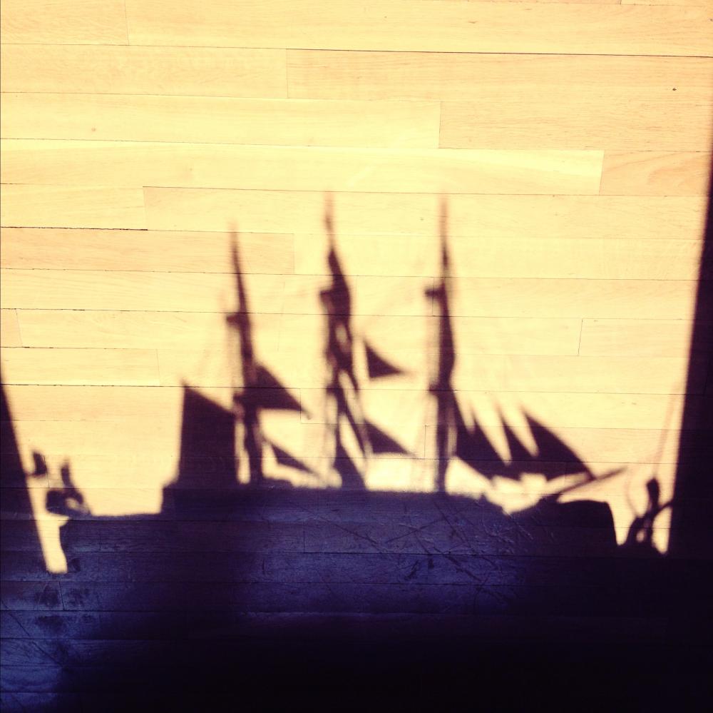 Two model ships in windows. One shadowed on the floor and one taken from the outside looking in. The first one is mine and the second one is my parents':