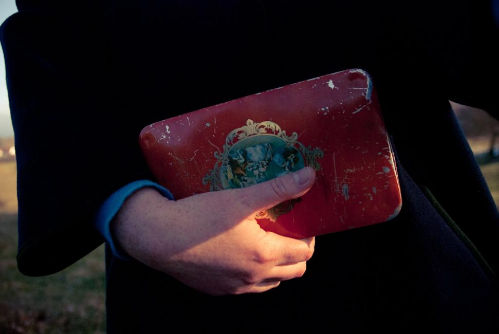 Hela tiden med plåtasken under armen.