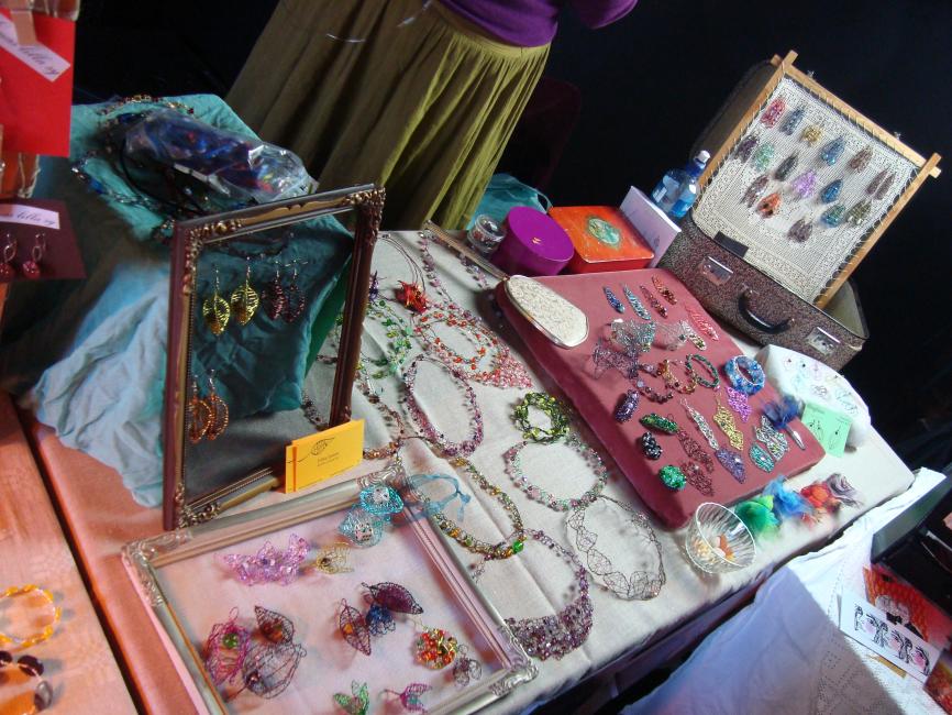Mitt bord stod uppe på scenen i ena hörnet och var först dolt i mörker sånär som på ett gäng röda scenlampor som alstrade så mycket värme att kunderna inte ville vara kvar. Och de som ändå kom dit kunde inte se mina smycken.
