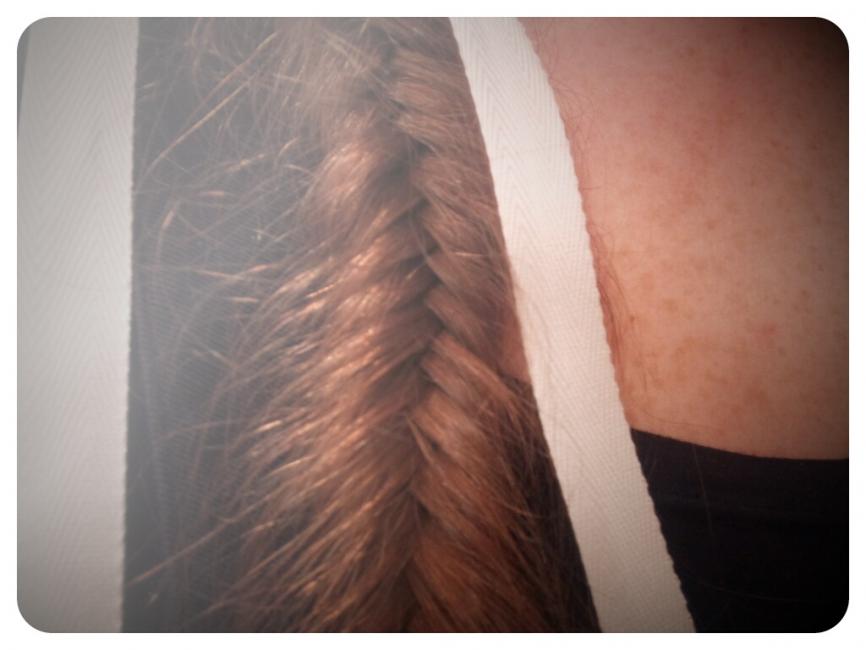Fiskbensfläta och ett vitt bomullsband som satt runt ett paket från USA en gång.