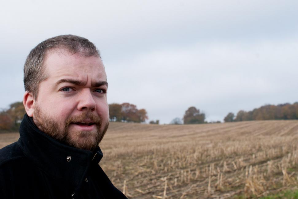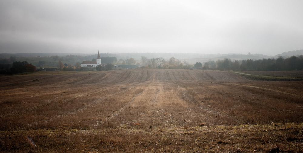 Där, på andra sidan majsfälten, ser man Rörums kyrka. (klicka på bilden för fin widescreenvy!)