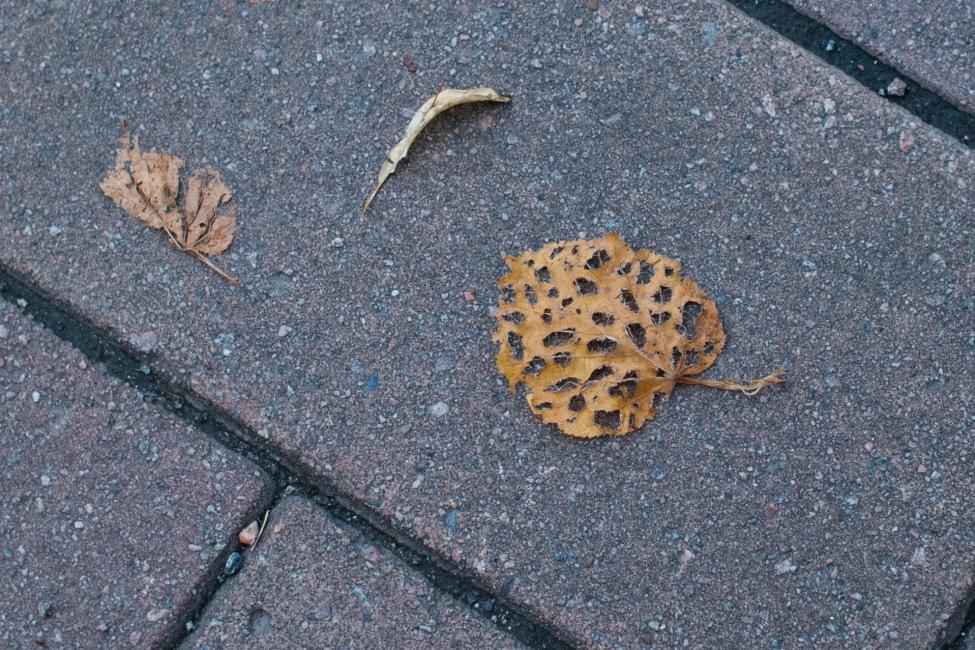 Flanerade hemåt och la märke till löven på marken. Särskilt ett, perforerat och mönstrat. Det låg där alldeles stilla och lät sig fotograferas när alla andra löv dansade runt omkring tillsammans med en blå plastpåse.