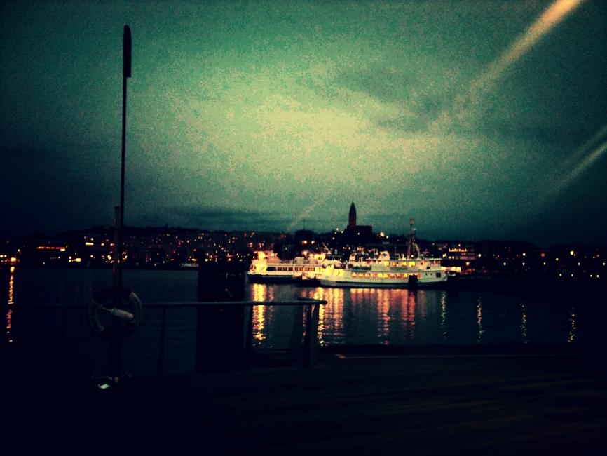 Efter jobbet sent ikväll cyklade jag längs med vattnet tills jag kom till det färjeläge som var det sista på den sidan om vattnet. Det mörknade och runt omkring mig stod en handfull människor med cyklar att luta sig mot i väntan på färjan.