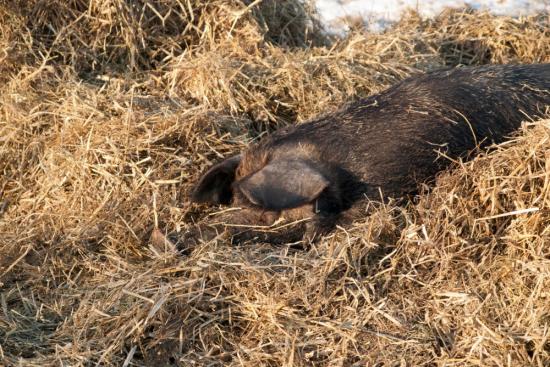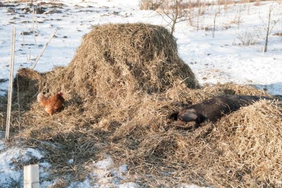The pig seemed to have the best of times there under the hay. He lay there grunting and enjoying the sun.