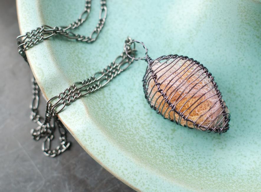 Väldigt ofta när jag gör smycken har jag en bild i huvudet av hur smycket ska se ut men allt eftersom jag jobbar förändras den bilden och i slutet blir det något helt annat. Men ibland är det verkligen den ursprungliga tanken som gäller. Så var det med den här halsbandsberlocken. Jag ville åt ljuset, det organiska utseendet och en jordnära färgskala. Blev så nöjd med känslan och formen. Sådär så att jag inte kan sluta titta och fingra på den. Och ljuset i fönstret sen när jag fotograferade! För mig kan det gärna få vara regniga dagar om ljuset lyser så här vackert genom molnen!