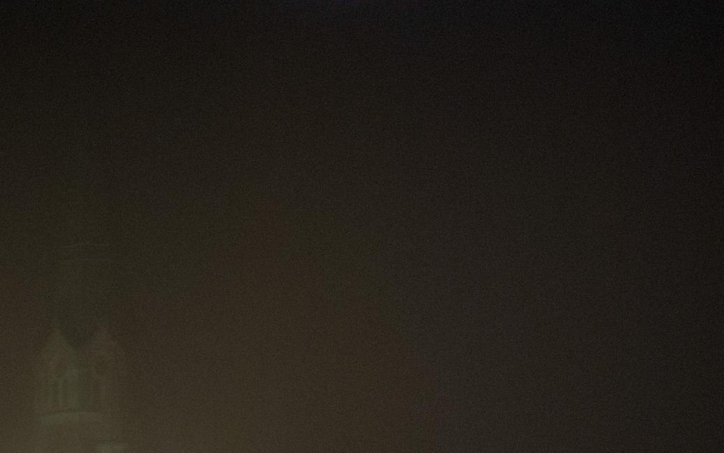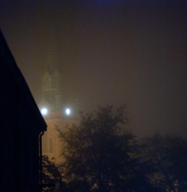 Dimman var så tät att jag knappt kunde se kyrktornet på andra sidan gatan. Jag inbillar mig att om jag sträcker ut min arm och drar den genom luften så ska det gå lite segare än i vanlig, dimfri, luft. Som om vi var omringade av förångad mjölk. Simmigt, föreställer jag mig.