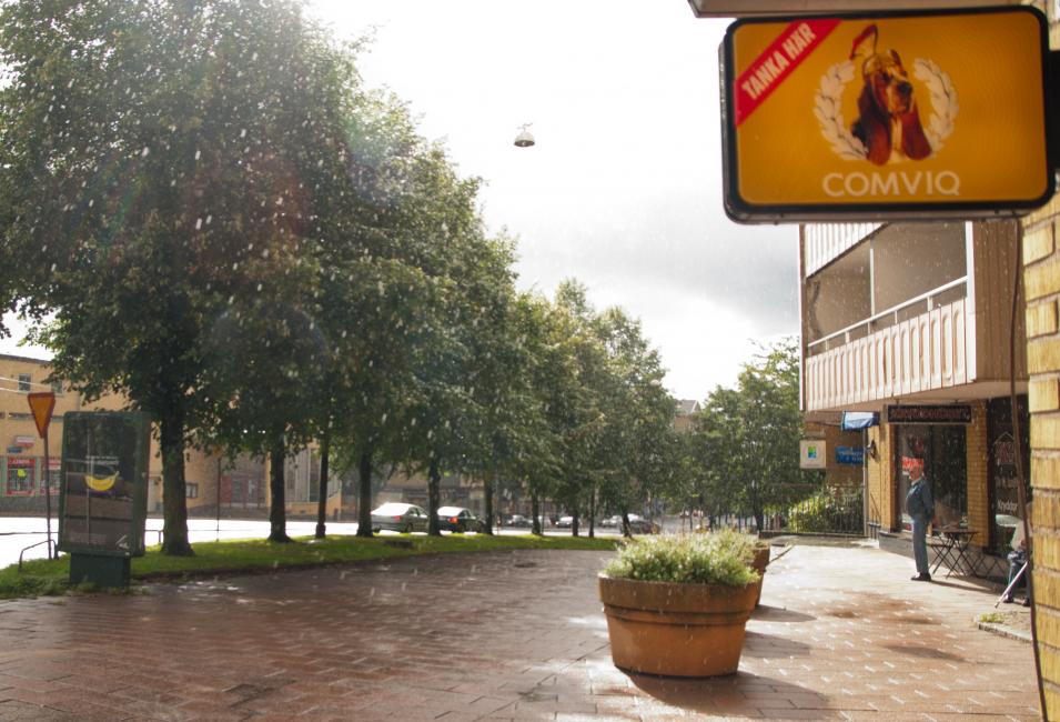 Innan det började regna och blåsa på det här viset var det en grå morgon med fint ljus och mörka moln. Vi åkte till andra sidan bron, till Hisingen, till Vågmästareplatsen, till rivningsområdet.