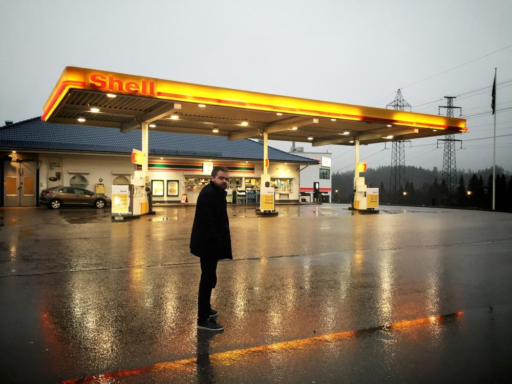 The weather was rainy and dreadful. Reststop posing is not David's main sport.
