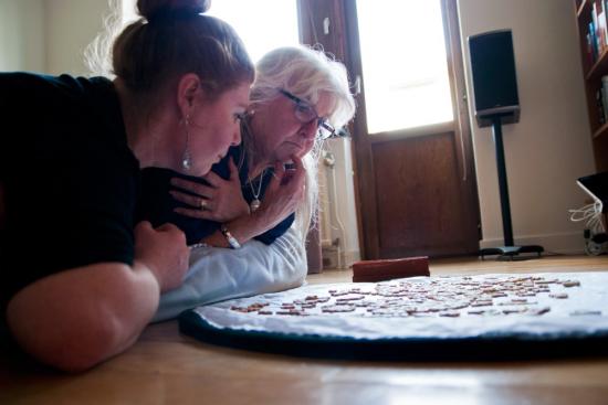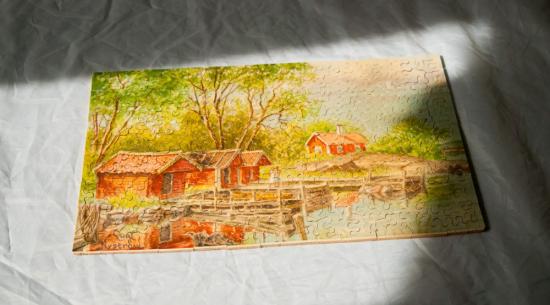 When we came home after an entire day walking around town we started with the old jigsaw puzzle I bought at a fleamarket a while ago. This is from the late 50's or early 60's. My mother and I collect these old jigsaw puzzles because they are not at all like the ones they sell nowadays. For one thing, there is no picture on the box so you have no idea how it will turn out. And each and every one of the pieces are different in size and shape.