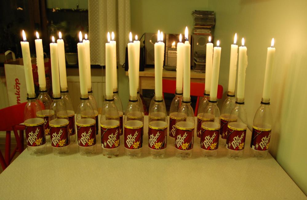 Idag lyser nitton ljus i nitton av Davids Dr Pepper-flaskor. Man skulle kunna tro att han samlar på dem, men när man säger det till honom blir han jättetjurig. Kan ju kanske ha med sockerdippar att göra...