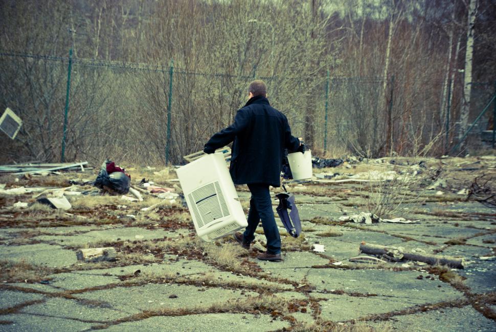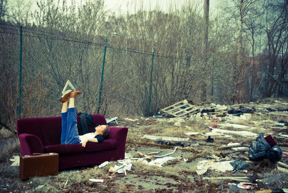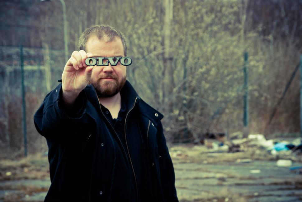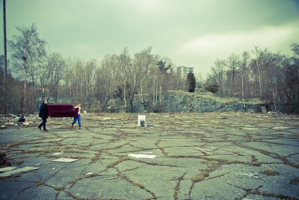 David är assistent och flyttar saker. Här tappar han en del av en lila dammsugare.