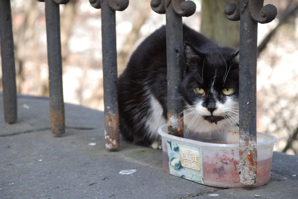 Katten tittade på oss med en blick som talade om svåra erfarenheter. Ett liv utan ljusglimtar. Han tog sig igenom var dag tillsammans med husse, alla dagar likadana, alla dagar en kamp om överlevnad. Men ändå: en glasslåda att äta ur som inte kan blåsa bort, ett skydd mot vind och vatten. Och kärlek från en annan varelse.