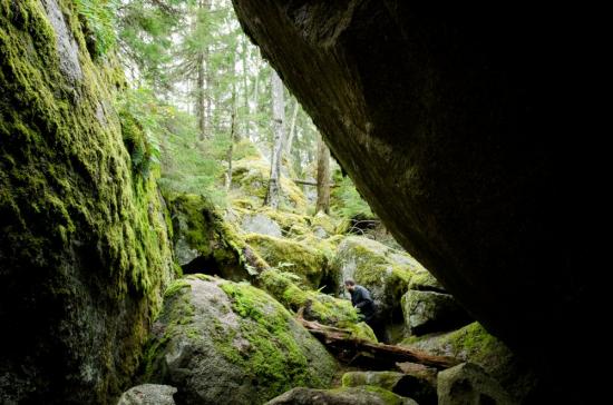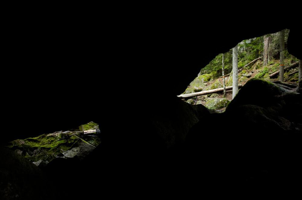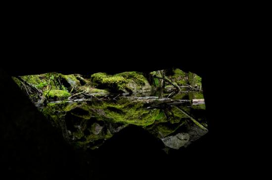 Kind of hard to understand this photo but to the right is the way out from under the rock and to the left is the water with a perfect mirror effect.