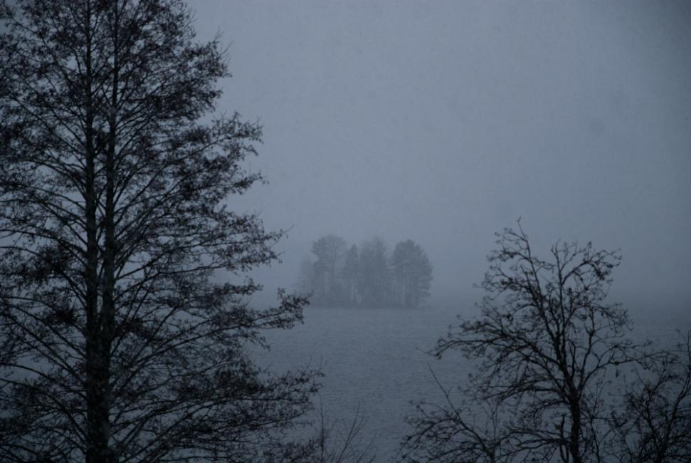 När vi kom tillbaks snöade det rakt åt höger och det gick knappt att se sjön i ovädret. Därute gömmer sig en ö.