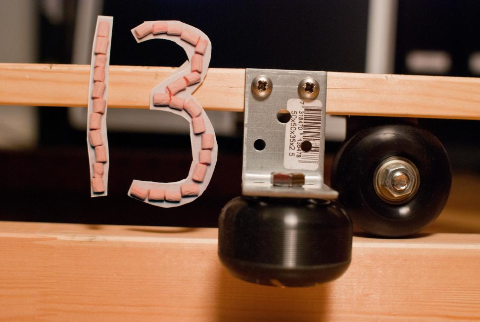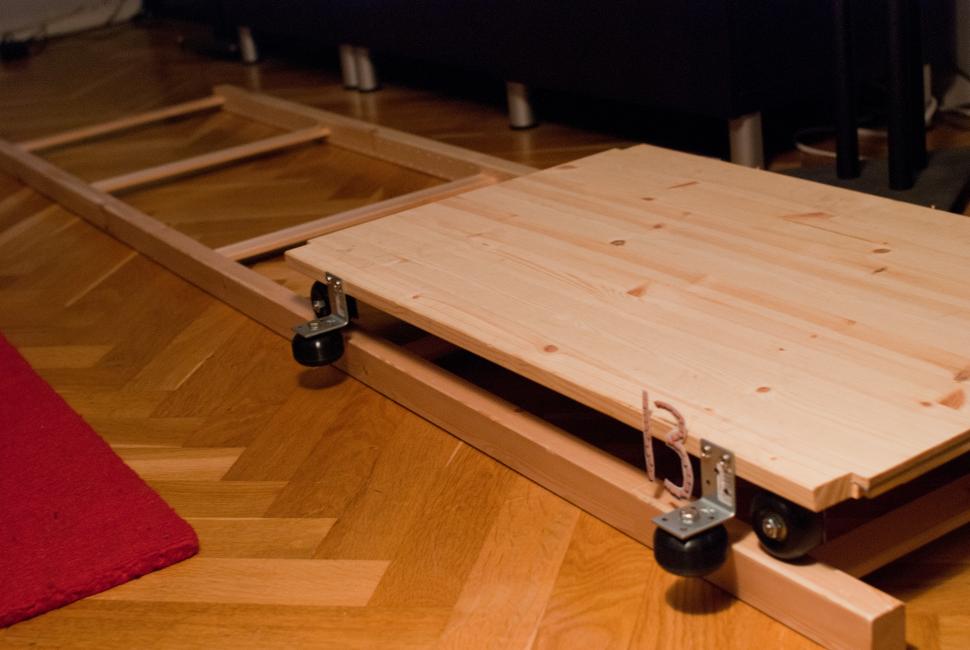 Idag är det Davids Dollyvagnshjul. Den är, som ni kanske ser, ett hemmabygge av skateboardhjul och en Lagerbokhylla från IKEA. Man tager vad man haver, och allt det där.
