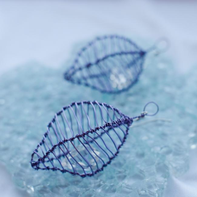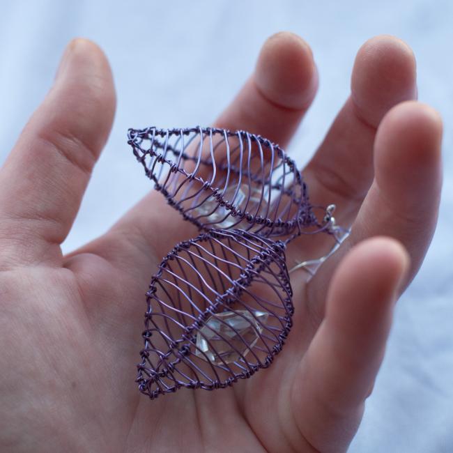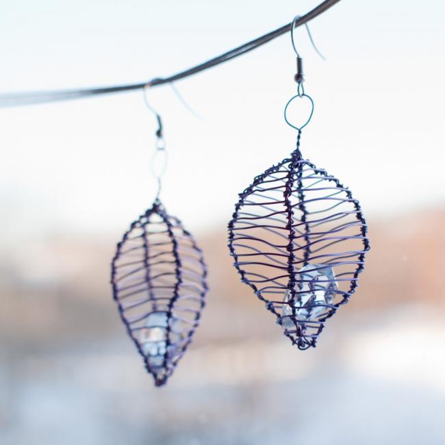 Lila burörhängen med en liten kristalldroppe inuti. Droppen är från en gammal kristallkrona. Dessa kan man köpa