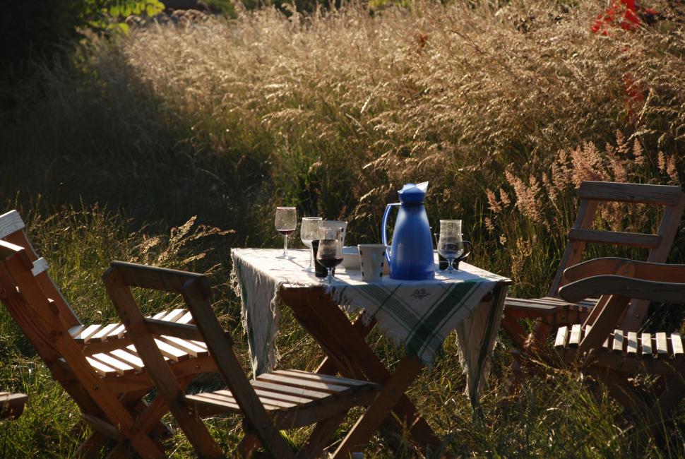 Vi gick en sväng på byn och kom tillbaks till dukat bord i kvällssol. Det blev ett par glas vin till innan det var dags för disk.