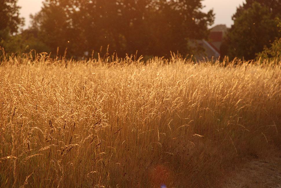 Det ser så varmt ut. De höga stråna plockar upp solskenet och återanvänder det. Sänder ut kvällsljus till grannstrået som skickar vidare tills hela ängen är upplyst. Det är tyst nu och ovanför ljusfältet gnistrar en och annan insekt till. De spröda vingarna blir till speglar som stråna kan spegla sig i.