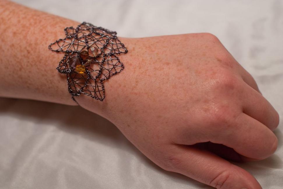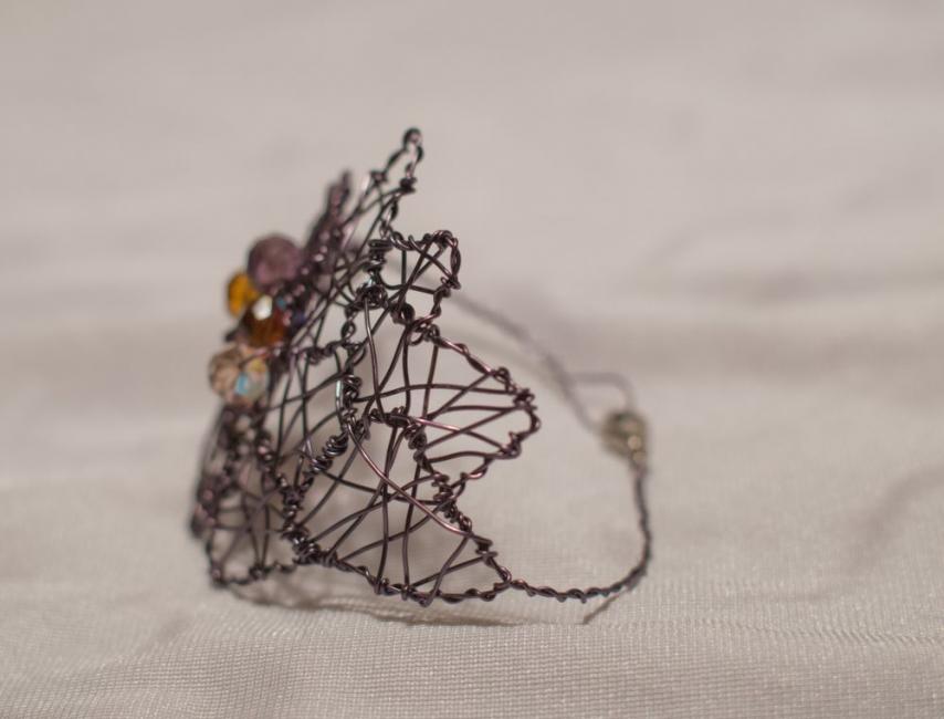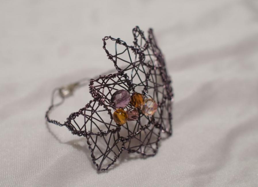 Armband Irregular pieces av varmt grå koppartråd och olika glaspärlor i plommon, bärnstensgult och champagne. 349 kr.