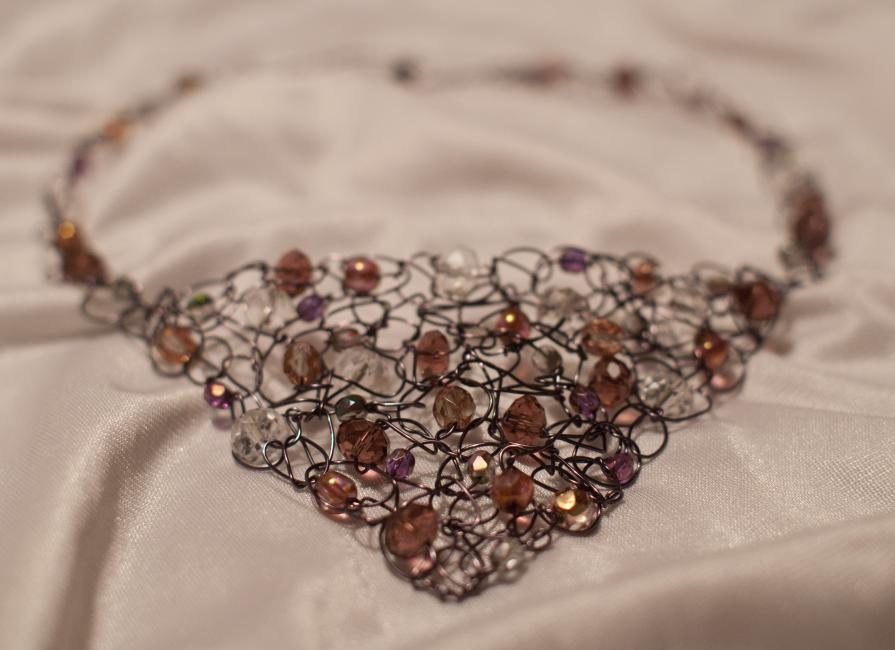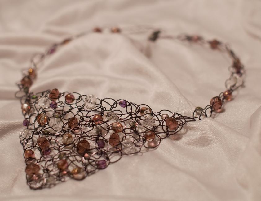 Halsband av gun metal-färgad koppartråd och tjeckiska pärlor i grått, plommon, aprikos och genomskinligt. 349 kr.