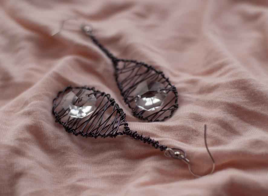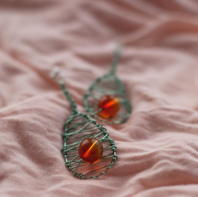 Örhängen av ljust mintgrön koppartråd med glaspärla som skiftar i orange och gul. Nederst: Örhängen av mörkt stålgrå koppartråd med kristall från kristallkrona. 189 kr paret kostar dessa.