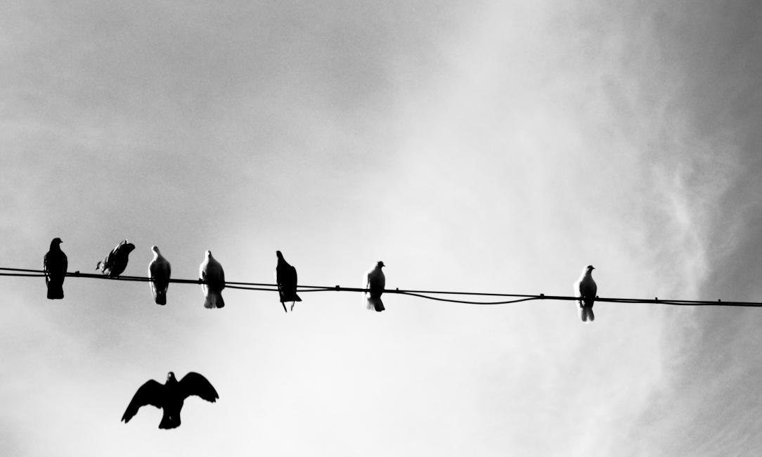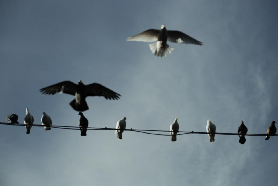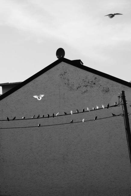 Jag har aldrig sett så många duvor på tråd förr. De delade på fyra ledningar. Helt plötsligt bytte några plats. Sen lyfte alla på en lina och flög iväg till en lite längre bort. Då flög i sin tur duvorna på linan bredvid och satte sig på den nu lediga linan. Det var som om de lekte den där leken där det finns en stol för lite och man måste byta plats på given signal och den som inte får sitta åker ut.