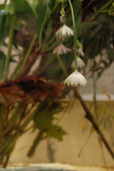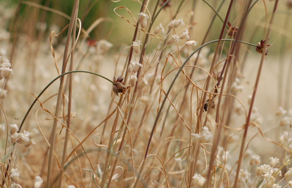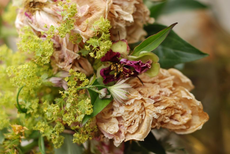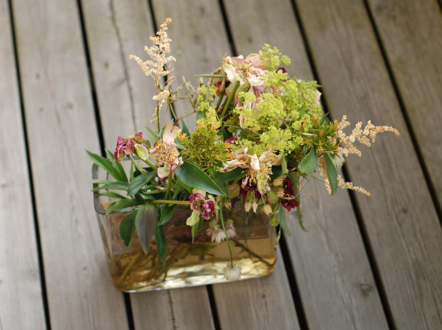 Färgerna är dova men många, och blommorna har fått vissna efter eget sinne. Falla där de vill, spreta där de vill det. Vattnet i vasen har ett liv för sig själv och stjälkarna.
