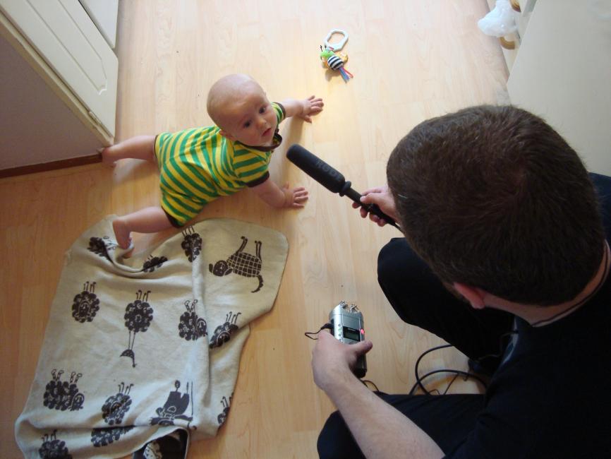 Vi hade finfrämmande idag. David tog tillfället i akt att ta fram inspelningsmakapären för att få bebisljud på band. Så fort micken hamnade framför lille Elis ansikte så tystnade han. Helt knäpptyst blev han.