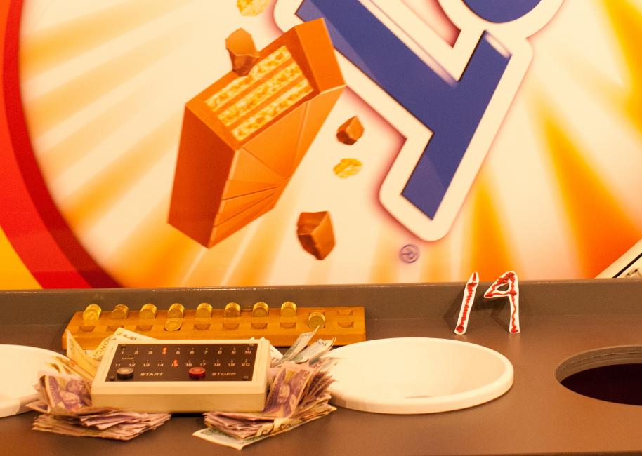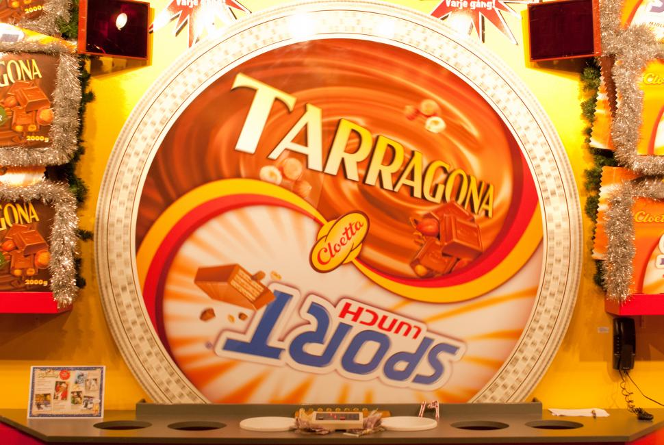 I första ståndet nekades vi och i Tobleroneståndet var det fullsmockat med folk, men i Tarragonaståndet blev det vinst. Eller, ja, alltså jag fick fota. Och tjejen placerade dagens datumsiffra framme vid hjulet. Siffran är idag gjord av ketchup som senare hamnade i papperskorgen.