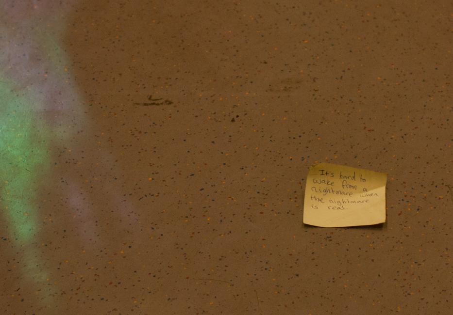 När de sedan reste sig för att kliva av ramlade den här lappen ur kvinnans ficka och landade precis framför fötterna på oss.