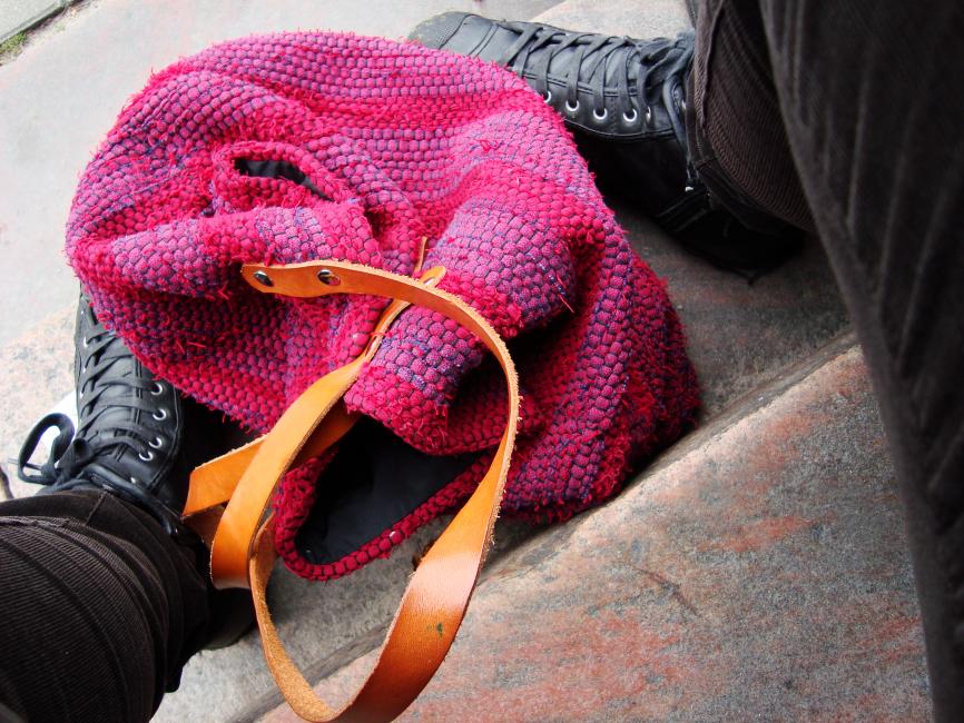 Just nu är det den här trasmatteväskan i fantastiskt varma färger. Och varje dag jag använder den får jag komplimanger från de mest skiftande personerna.