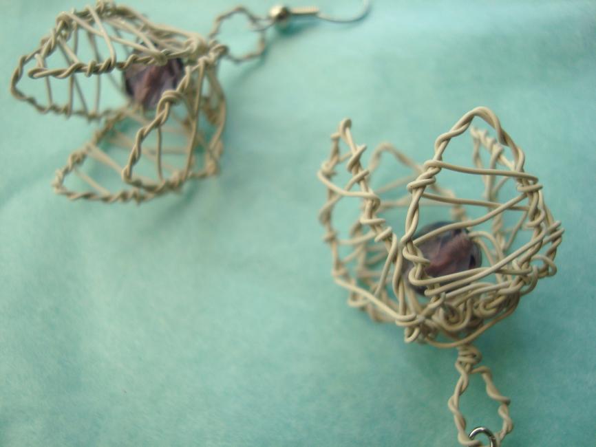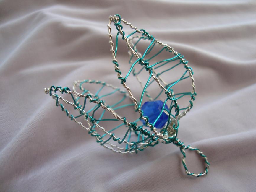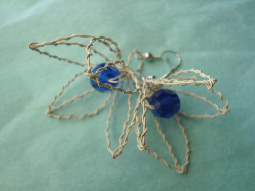 Tvåfärgad blomberlock i turkos- och silverfärgad koppartråd med stor blå antik glaspärla. 145 kr kostar denna.