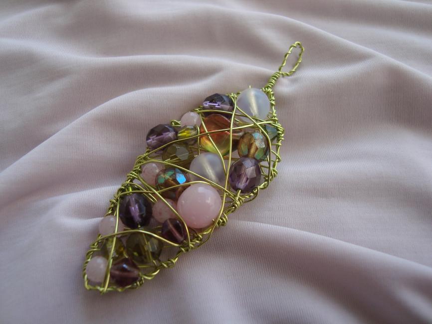 Berlock i gulgrön koppartråd med pärlor i olika lila, rosa, gröna nyanser. 145 för denna som mäter ungefär tio centimeter från öglans topp till berlockens nederkant.