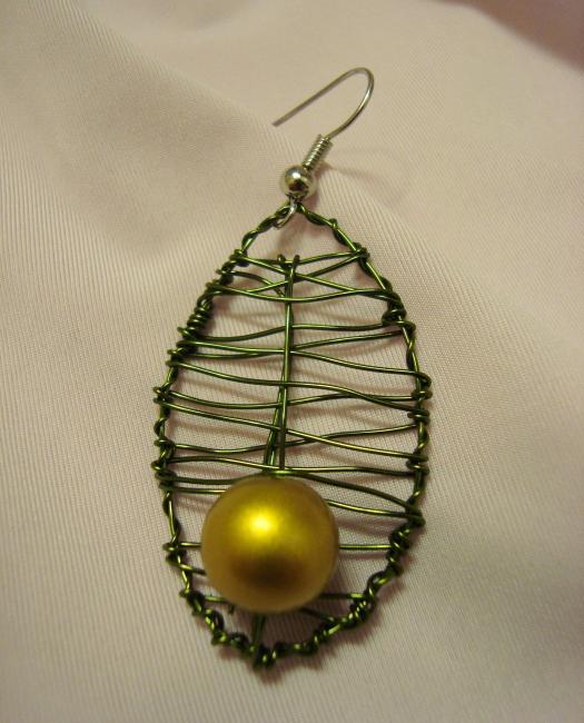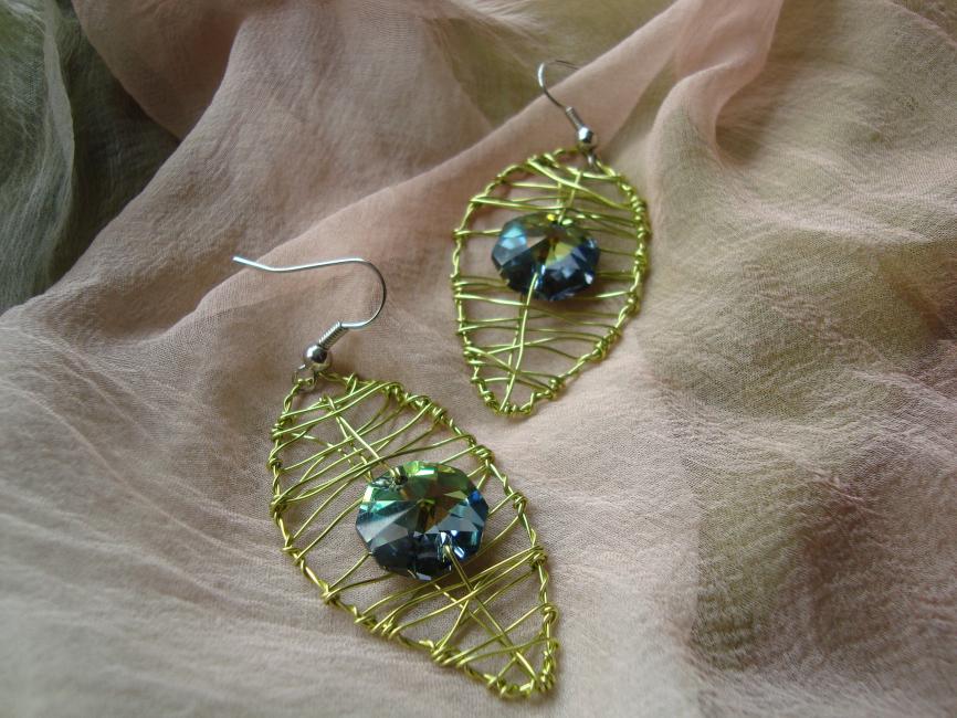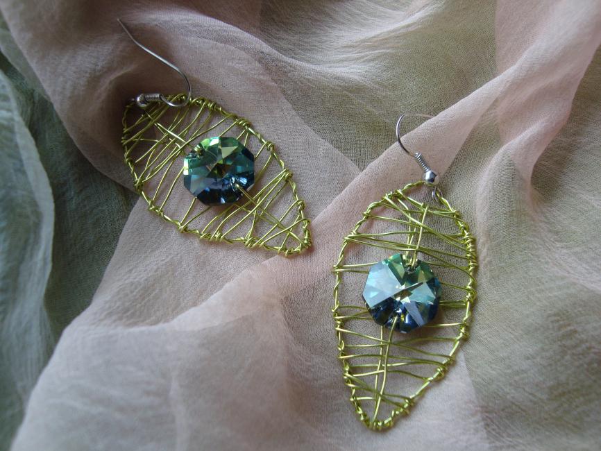 Örhängen av guldgrön koppartråd och tjeckisk kristall som skiftar i grönt och blått. 189 kr.