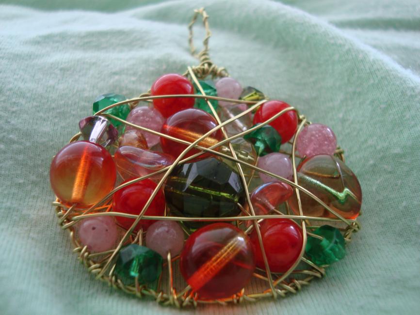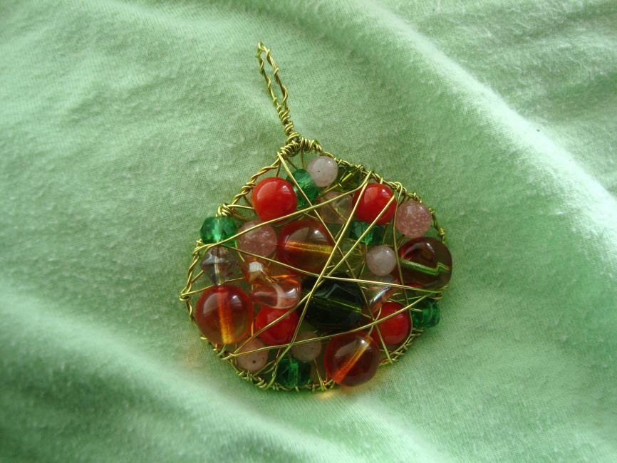 Berlock i guldgrön koppartråd med pärlor i olika orangea, gröna och rosa nyanser. 159 kr.