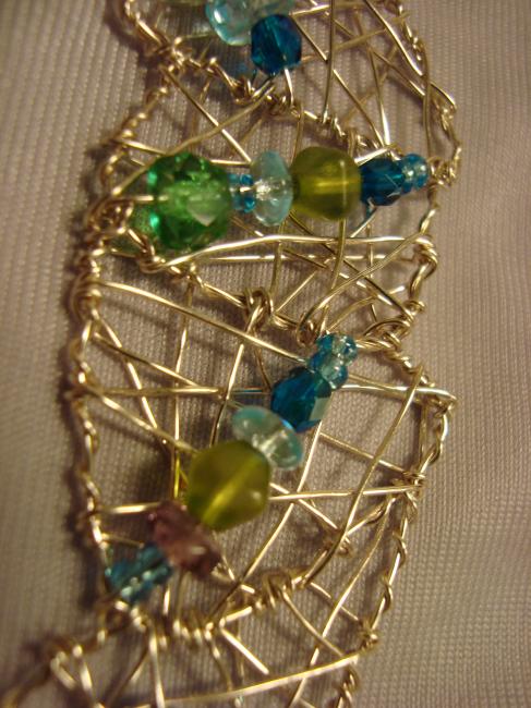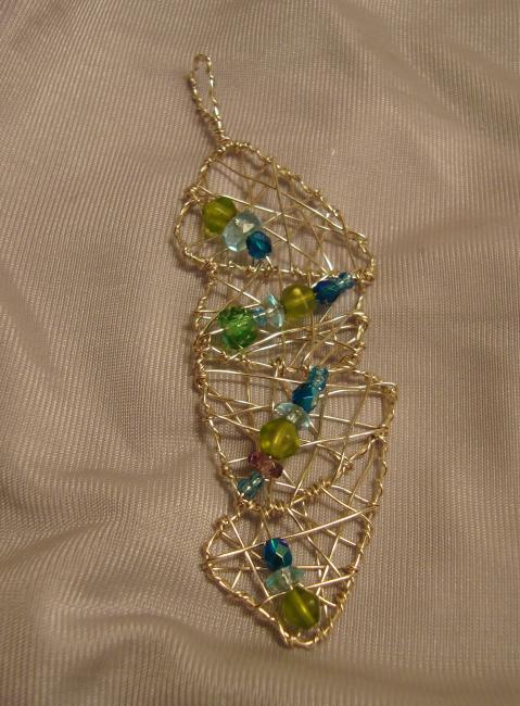 Berlock med silverfärgad koppartråd och glaspärlor i grönt, blått och plommon. 149 kr.