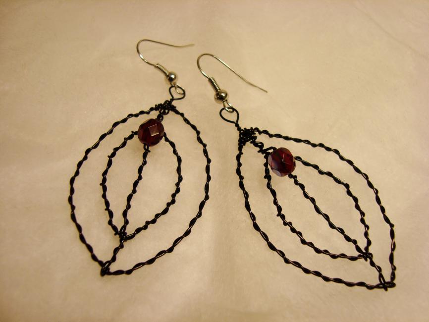 Svarta blingfitteörhängen med blodröd facetterad glaspärla. Dessa är paxade. 155 kr för liknande.