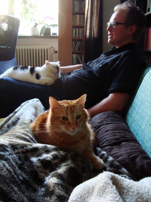 Jonas och katterna Tjocktove och Rambo.