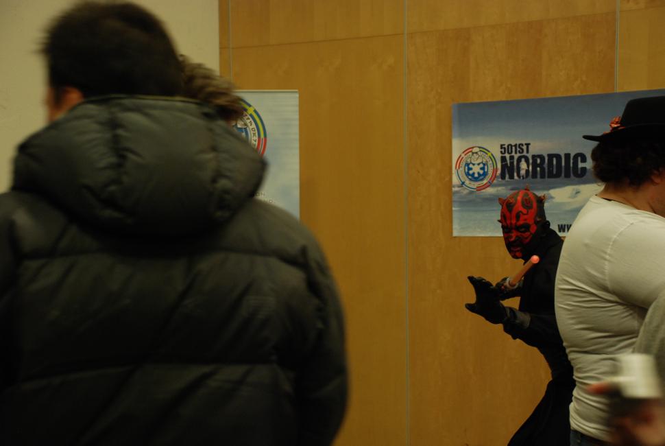 Jag skämdes lite i kön när en nörd av rang kom gående mot mig iklädd Storm troopers-outfit. Han pekade med sitt vapen mot alla i kön och spatserade "hotfullt" fram och tillbaks. Så fort någon plockade fram sin kamera ställde sig nörden i nån tuff pose, och han verkade synnerligen nöjd med uppmärksamheten. Jag kunde inte titta på honom. Inte för att jag egentligen har nåt emot nördar, som jag sa innan så räknar jag mig själv som en av dem, men jag har svårt för när de blir på sånt allvar. Det känns inte som det får plats nån humor under den glänsande hårda plastkostymen.