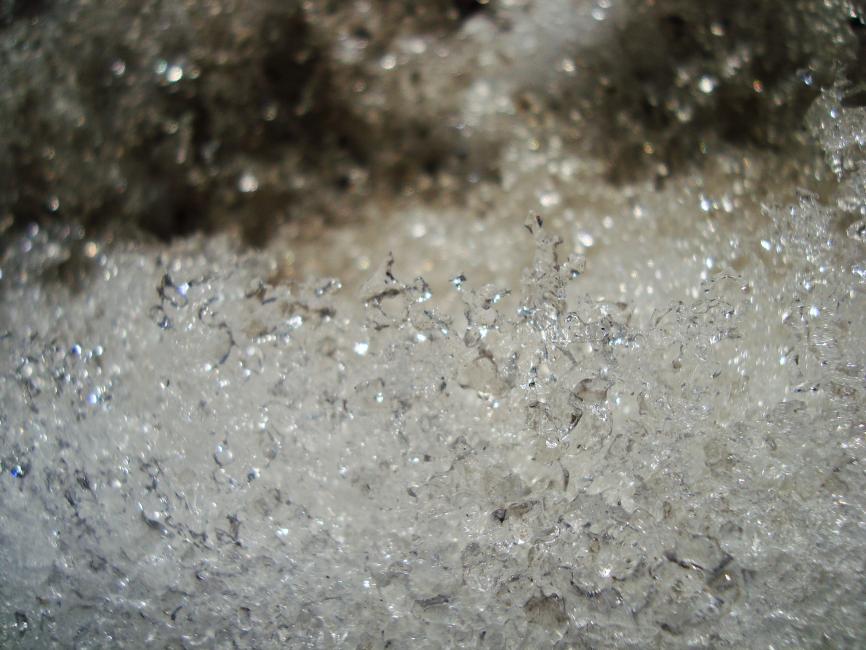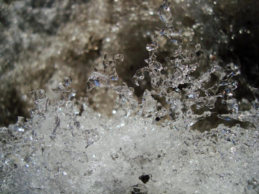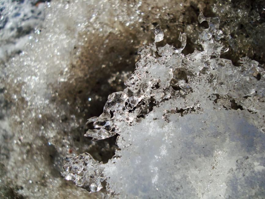 Nä. Det är ingen fräsande fors. Det är snöhögen utanför huset. Men i solsken och töväder kan man drömma sig bort till brusande bäckar med vitsippsklädda sluttningar runt omkring.