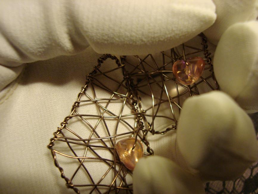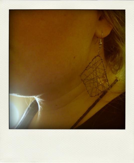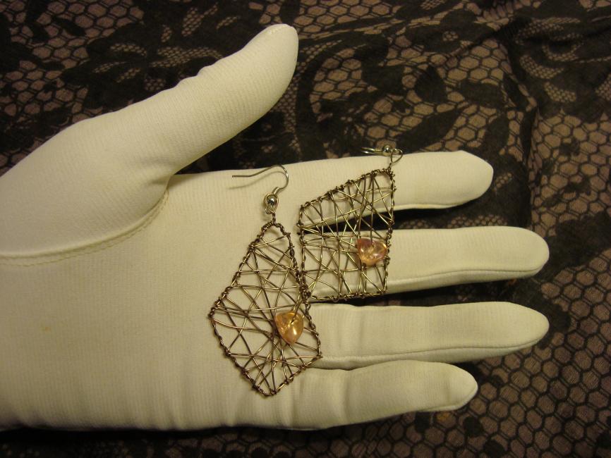 Örhängen i gråbrunfärgad koppartråd med laxrosa pärla. 189 kr.