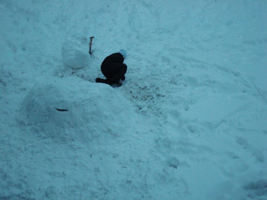 Och plötsligt tittade en vit toppluva fram ur öppningen. Resten av pojken följde strax därpå och sedan sprang han, med sin kumpan hack i hälen, över snötäckt mark bort från kamerans sikt.