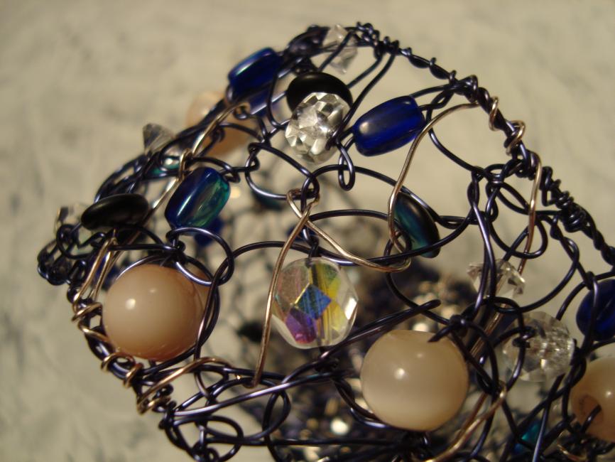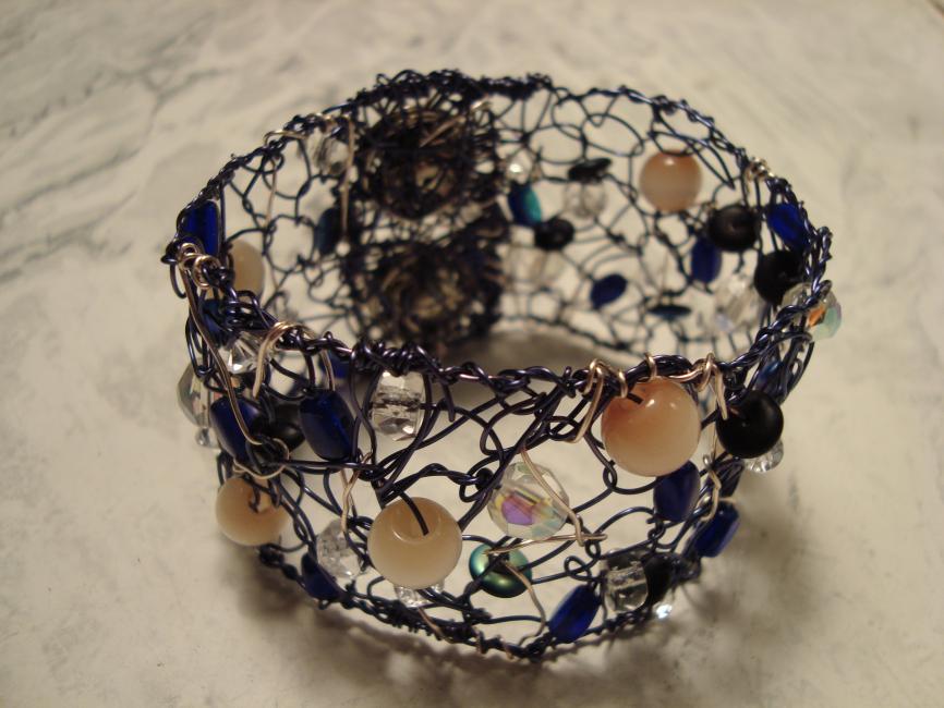 Armband av marinblå och silverfärgad koppartråd med pärlor i cremefärgat, blått och glas. 349 kr för ett liknande.