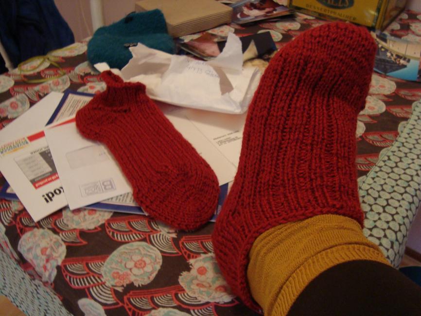När jag kommer hem från jobbet första dagen efter förkylning, så trött som det är möjligt att vara, och hittar ett paket systerstickade, djupröda, raggsockor i brevlådan.